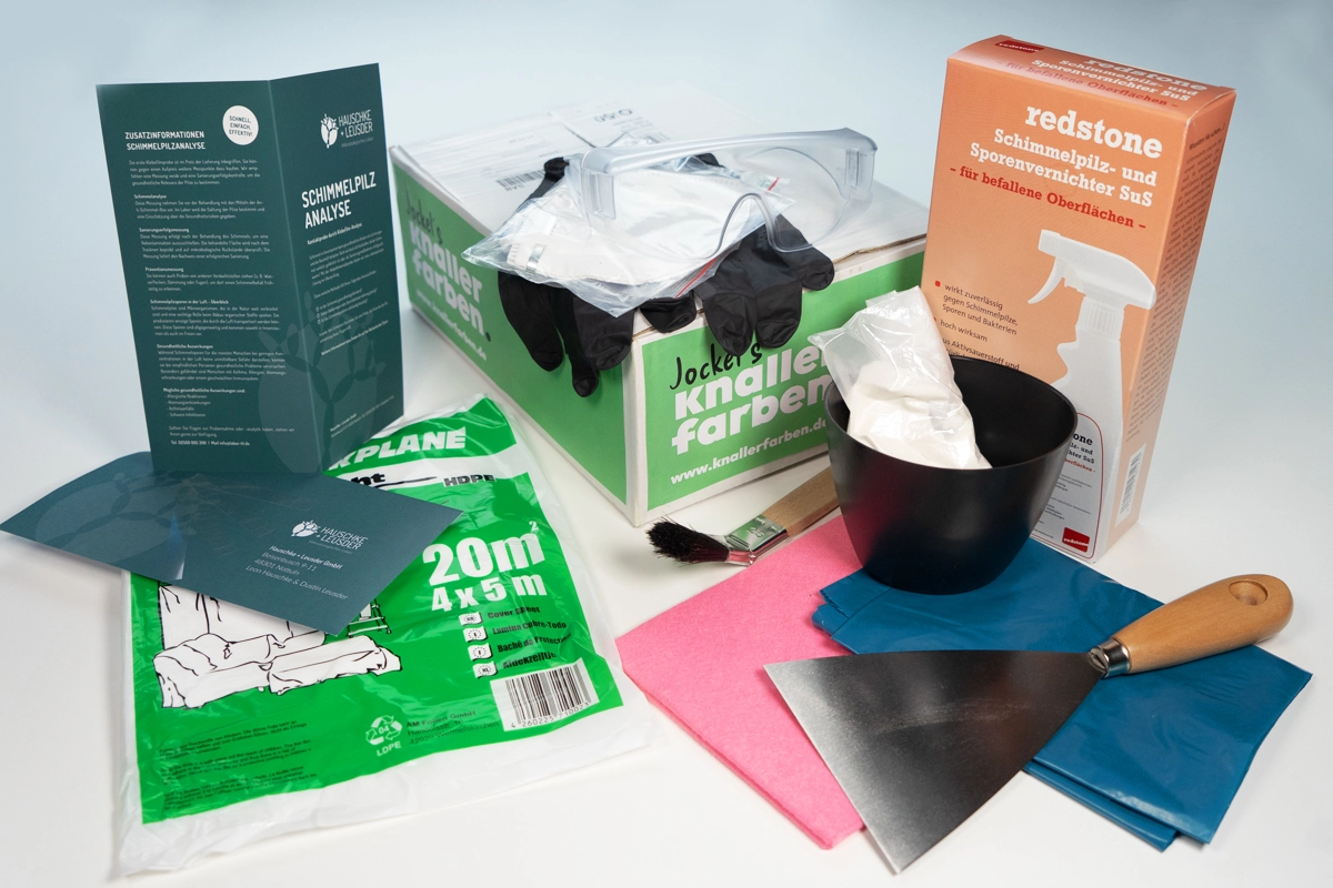 Schimmel- und Sporenvernichter, Professionelle Schimmelpilzanalyse, Videoanleitungen, Schwamm, Schutzbrille und Handschuhe, etc.